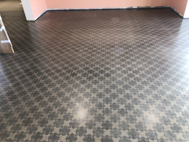 If a bold pattern isn’t the right fit or the existing concrete color isn’t working for the space, a full-floor stain offers a clean, cohesive solution. Some clients opt for stained zones, like color-blocked sections to define work areas. Either way, the result is sharp, modern, and polished.